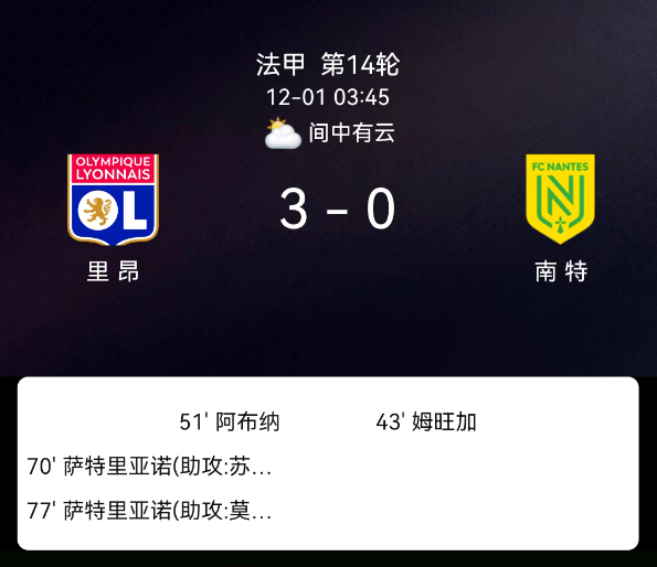 北京时间12月1日,法国足球甲级联赛第14轮,里昂主场对阵南特。第43分钟姆万加直红;第51分钟阿布纳破门,1-0;第70分钟萨特里亚诺破门,2-0;第77分钟萨特里亚诺再破门,3-0;南特1红2黄、里昂1黄。最终比分,里昂3-0南特。