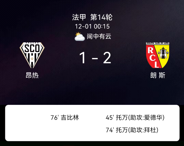 北京时间12月1日,法国足球甲级联赛第14轮,昂热主场对阵朗斯。第32分钟昂热染黄;第45分钟托万破门,0-1;第68分钟朗斯染黄;第74分钟托万再破门,0-2;第76分钟哈鲁纳-吉比林破门,1-2;共2张黄牌无红牌。最终比分,昂热1-2朗斯。