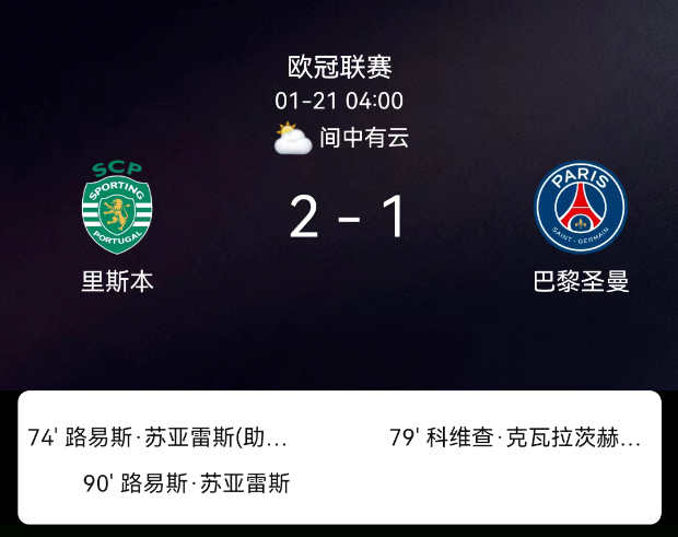 北京时间1月21日,欧洲冠军联赛联赛阶段第7轮,里斯本竞技主场对阵巴黎圣日耳曼。第74分钟路易斯-苏亚雷斯破门,1-0;第79分钟克瓦拉茨赫利亚破门,1-1;第90分钟路易斯-苏亚雷斯头球绝杀,2-1;双方无红黄牌。最终比分,里斯本竞技2-1巴黎圣日耳曼。