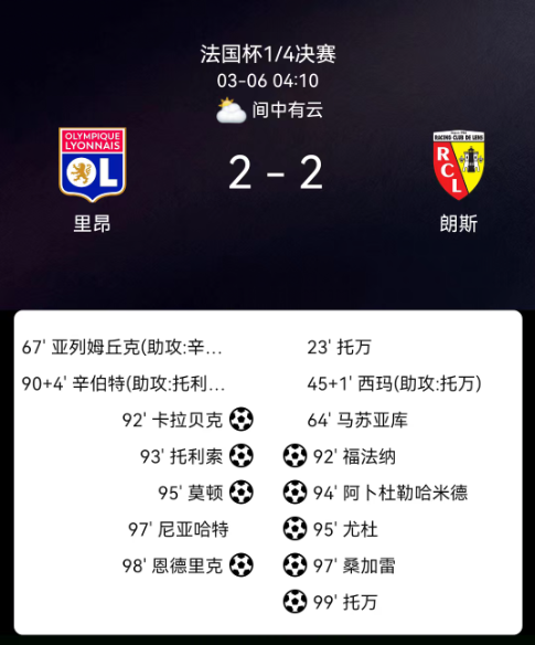 北京时间3月6日,法国杯1/4决赛迎来焦点对决,里昂主场迎战朗斯。上半场第23分钟,托万门前补射为朗斯先拔头筹,补时阶段他又助攻西马扩大比分。下半场第67分钟,亚列姆丘克头球扳回一城,第90+4分钟,里塞出击失误,安贝尔吊射绝平将比赛拖入点球大战。点球大战中朗斯5-4胜出,总比分7-6击败里昂,成功晋级法国杯四强。