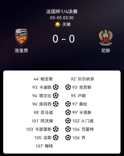 北京时间3月5日,法国杯1/4决赛迎来一场激烈较量,洛里昂主场迎战尼斯。双方在常规时间内激战至平局,始终未能分出胜负,比赛被迫进入残酷的点球大战。点球环节中,若纳唐-克洛斯稳稳罚进关键点球,而巴莫-梅特遗憾失点,成为比赛转折点。加上上半场第44分钟洛里昂球员帕吉被红牌罚下,球队少打一人陷入被动。最终尼斯通过点球大战以6-5击败洛里昂,成功晋级半决赛。