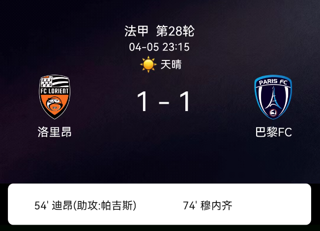 北京时间4月5日,法国足球甲级联赛第28轮,洛里昂主场对阵巴黎fc。上半场双方攻防节奏平稳,虽互有进攻尝试但均未能转化为进球,半场以0-0收场。下半场比赛局面逐渐打开,洛里昂率先发力,第54分钟帕吉送出助攻,班巴-迪昂抓住机会破门,帮助主队在主场取得1-0领先。巴黎fc并未就此放弃,持续向对手防线施压,第74分钟穆内西挺身而出打入扳平进球。此后双方均未能再次改写比分,全场比赛结束,洛里昂1-1战平巴黎fc。