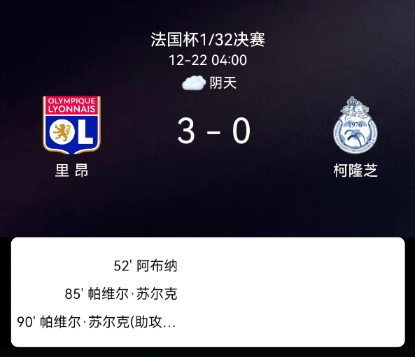 北京时间12月22日04:00,法国杯1/32决赛,里昂主场对阵圣西尔柯隆芝。第52分钟阿布纳破门,1-0;第85分钟舒尔茨建功,2-0;第90分钟舒尔茨双响,3-0;全场无红黄牌。最终比分,里昂3-0圣西尔柯隆芝。
