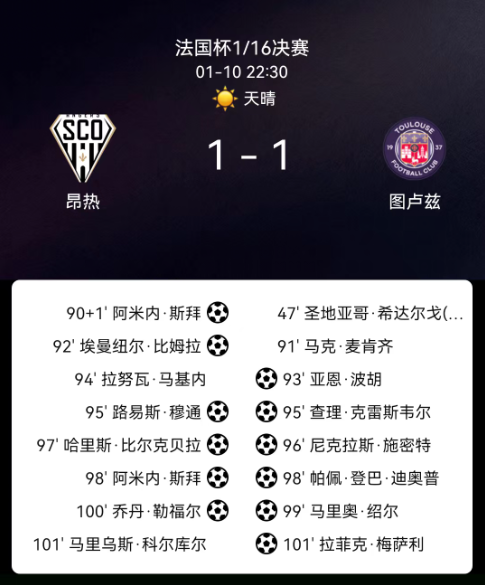 红黄牌情况:全场共产生2张黄牌,昂热和图卢兹各1张,无红牌判罚。两队常规时间战平,图卢兹凭借点球大战的表现顺利晋级下一轮。