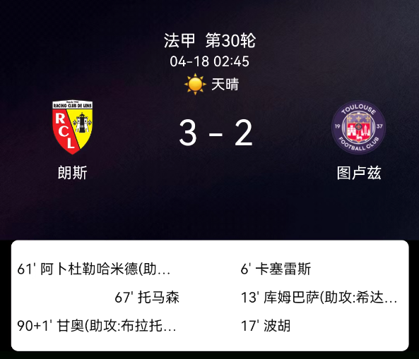 北京时间4月18日,法国足球甲级联赛第30轮,朗斯主场迎战图卢兹。上半场开场仅6分钟,克里斯蒂安-卡塞雷斯便轰出远距离重炮闪击得手,图卢兹客场取得领先;第13分钟孔巴萨头球破门,将比分扩大为2-0。第16分钟比赛出现转折,格博霍蹬踏犯规被直接红牌罚下,图卢兹只能以十人应战。下半场朗斯抓住人数优势大举反攻,第61分钟沙特-阿卜杜勒哈米德头球扳回一城,第67分钟托马森补射扳平比分,补时第1分钟加尼乌利用角球机会头球完成绝杀。全场比赛结束,朗斯3-2逆转战胜图卢兹。